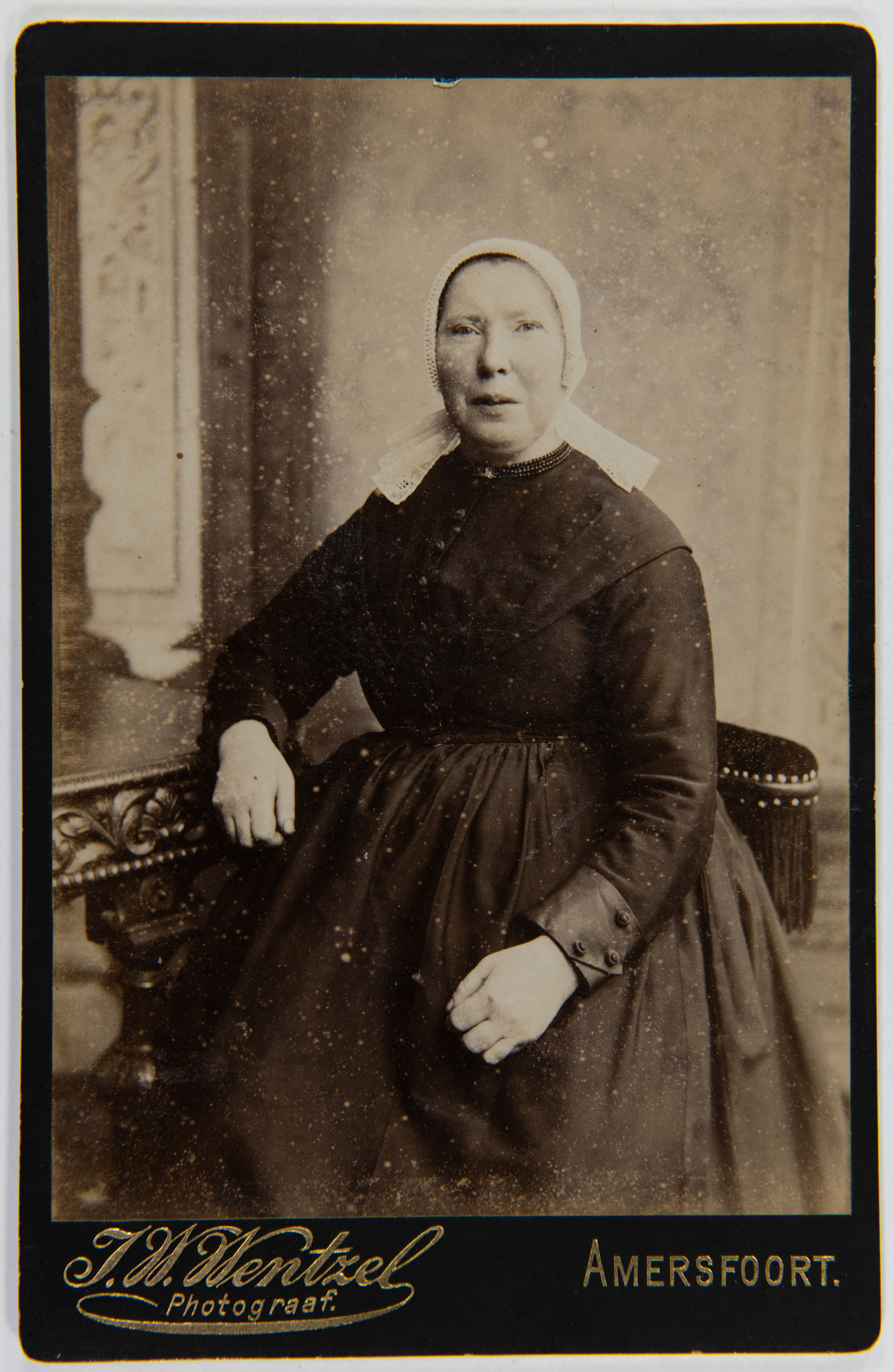 Jannetje Krop, geboren 16 januari 1823 te Soest. Zij trouwde op 6 augustus 1847 met Willem Karel Knoppers. Zij overleed 26 oktober 1901 op 74 jarige leefijd. Haar zoon Jacob Knoppers staat elders op deze pagina afgebeld. Deze foto is gemaakt op 1 augustus 1888 door F. de Groot.