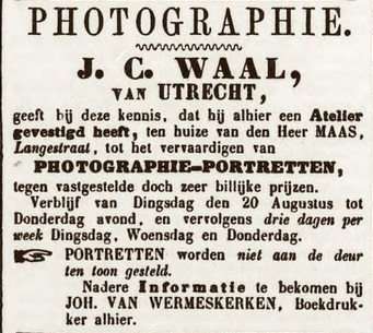 Op 20 augustus 1861 vestigde de Utrechtse fotograaf J.C. Waal in het huis van de heer Maas in de Langestraat een atelier “ tot het vervaardigen van photographie-portretten”. Hij portretteerde op dinsdag, woensdag en donderdag